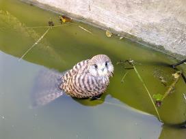 Nach dem ersten Flugversuch landet der Jungfalke im Wasser |